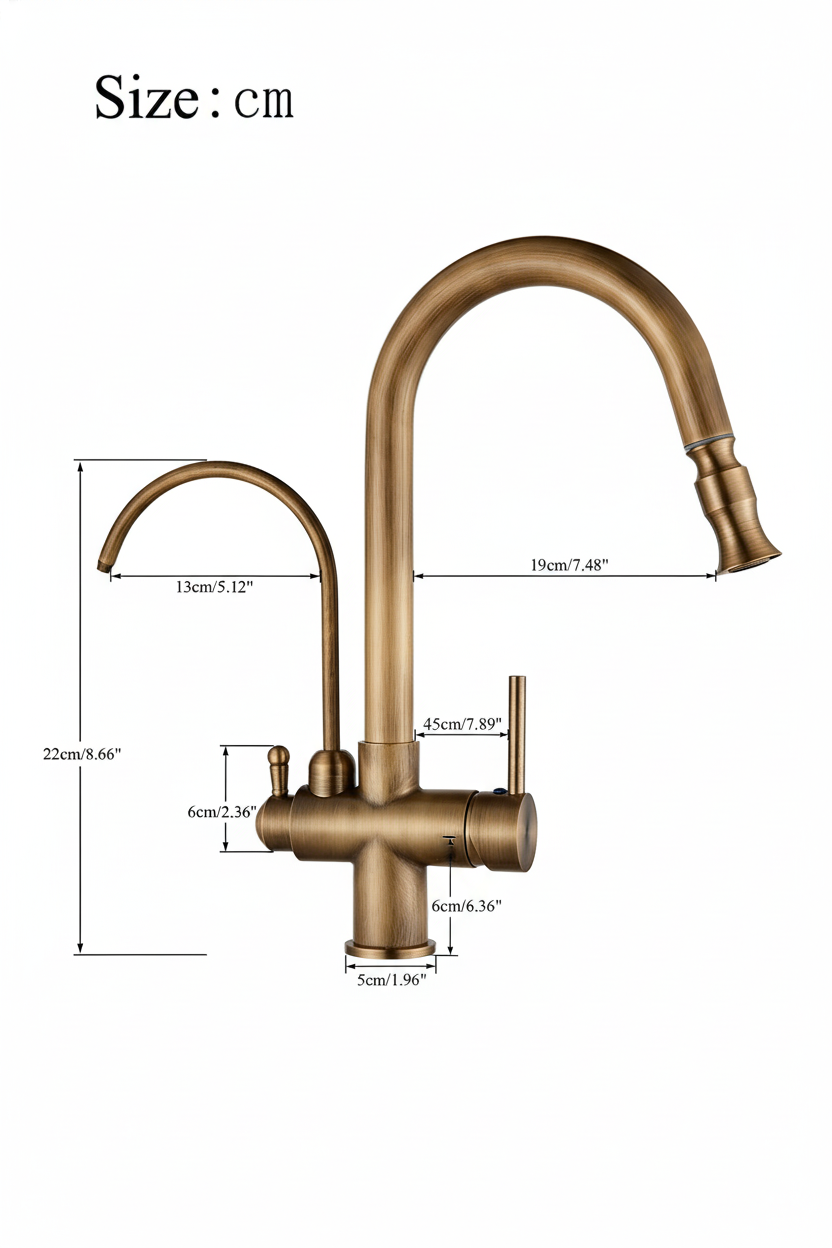 Dieser elegante Wasserhahn kombiniert antikes Design mit moderner Funktionalität. Ideal für die Küche, bietet er eine praktische Lösung für die Zubereitung von reinem Trinkwasser und ist gleichzeitig ein stilvolles Element in Ihrer Einrichtung.