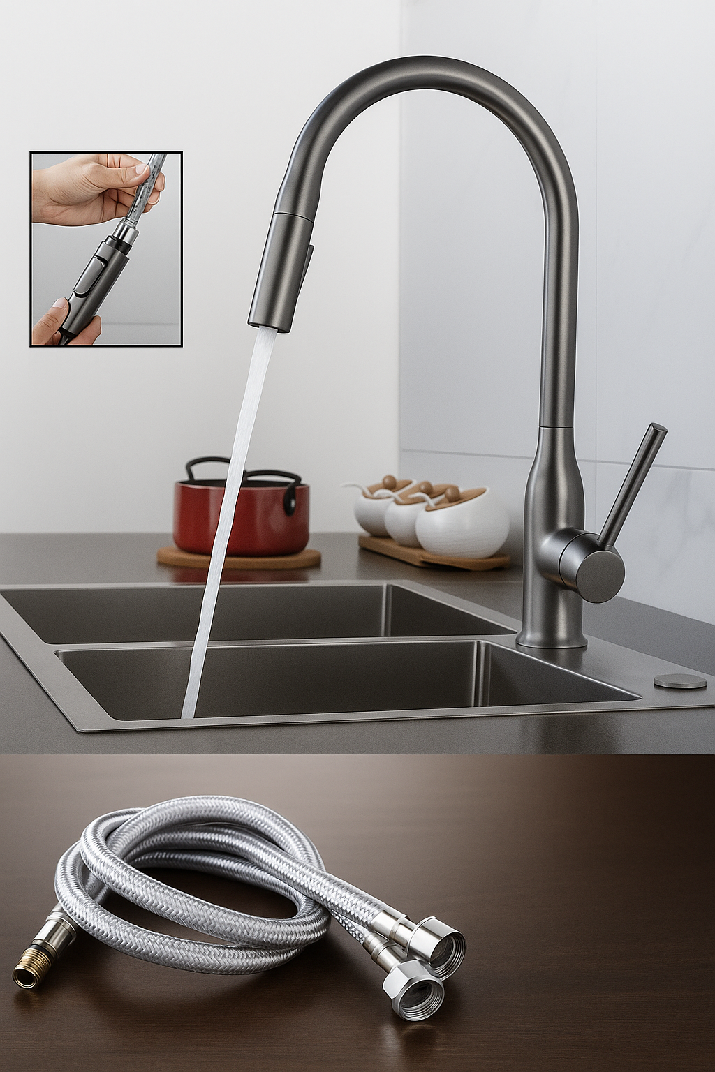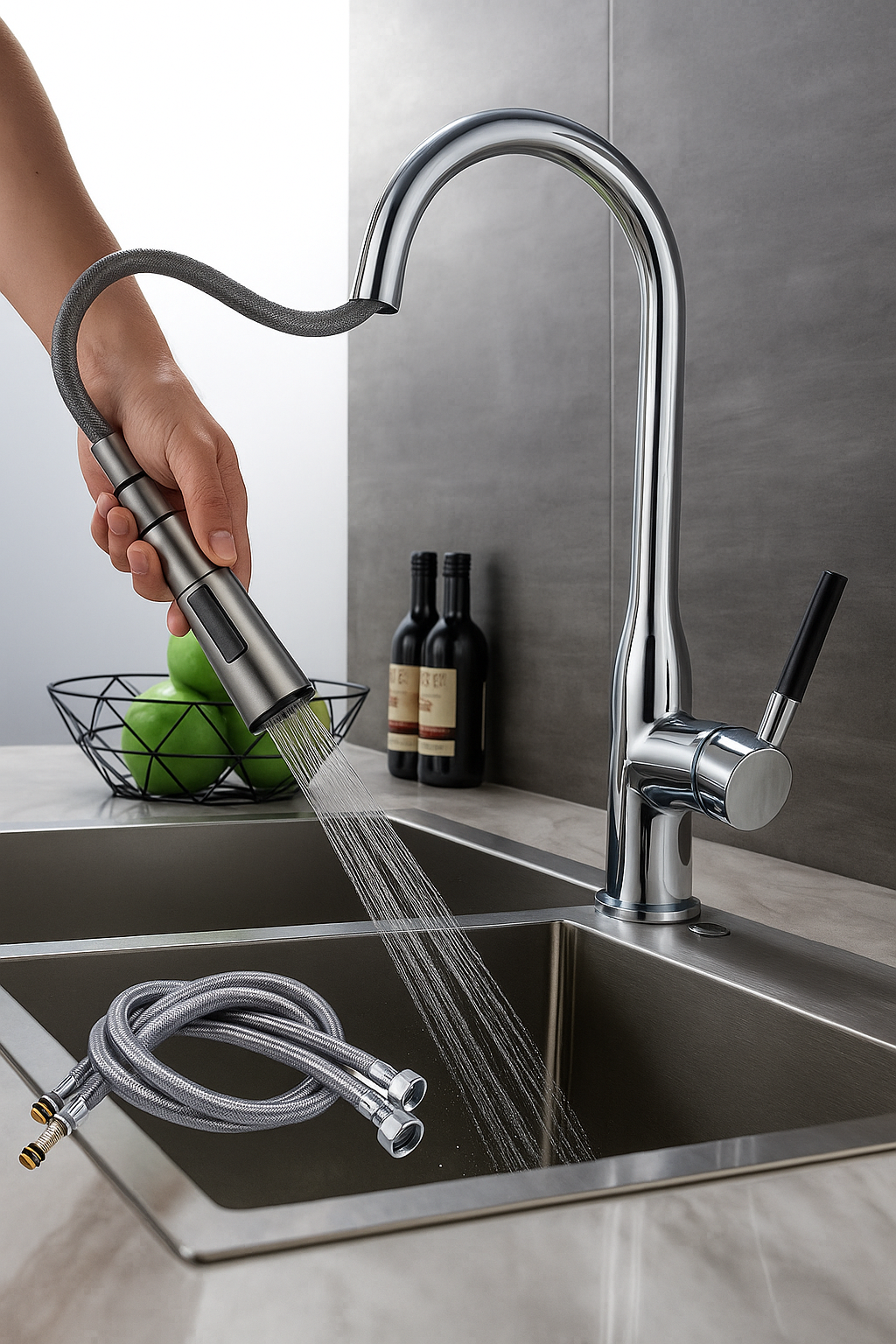 Die AquaFlex Küchenarmatur kombiniert modernes Design mit höchster Funktionalität und Komfort. Mit ihrer praktischen ausziehbaren Handbrause erleichtert sie das Abspülen von Gemüse, das Befüllen großer Töpfe sowie die gründliche Reinigung des Spülbeckens. Die gebürstete Nickeloberfläche verleiht ihr eine elegante, zeitlose Optik, die Fingerabdrücken widersteht und sich perfekt in jede moderne Küche einfügt.