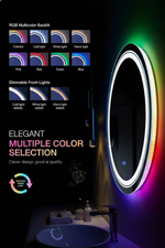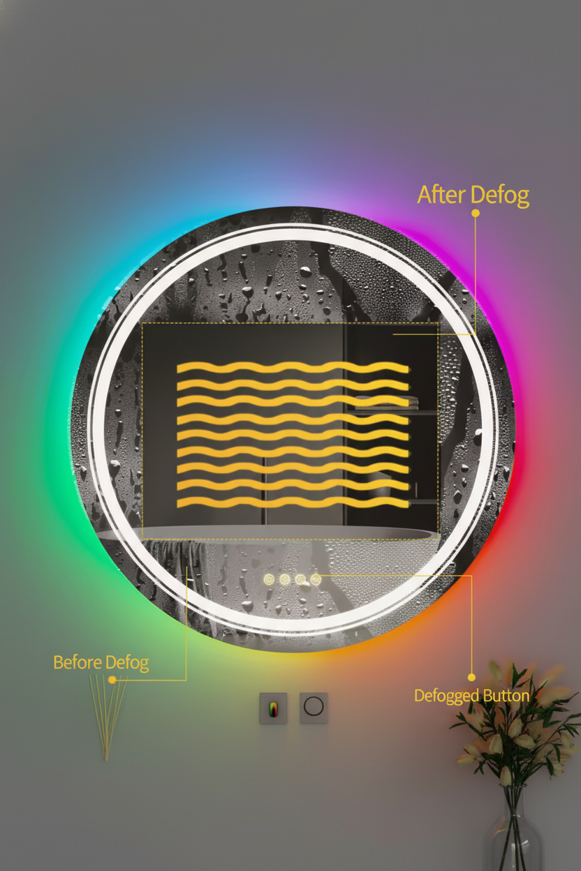 Der Liora Rundspiegel verleiht jedem Badezimmer eine moderne, ruhige und stimmungsvolle Atmosphäre. Sein klarer, kreisrunder LED-Rahmen kombiniert warmes, neutrales und kühles Frontlicht mit sanften RGB-Akzenten auf der Rückseite. Mit Anti-Fog-Technologie, Memory-Funktion und präziser Touch-Steuerung schafft er ein luxuriöses Spa-Gefühl in Ihrem Alltag.